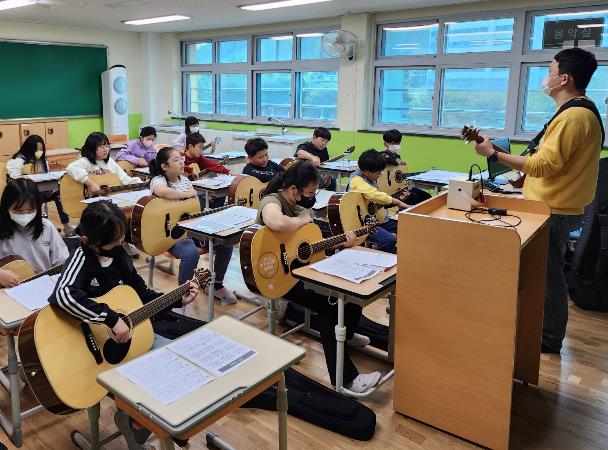 ‘통기타 행복 교실’은 관내 초등학교에 악기(통기타)와 전문 강사를 지원해 학내 문화예술 교육 기반을 조성하기 위한 ‘1인 1악기’ 사업의 일환이다. 지난 2019년 4개교 6학급으로 시작해 올해는 10개교 28학급 570여 명을 대상으로 운영한다.