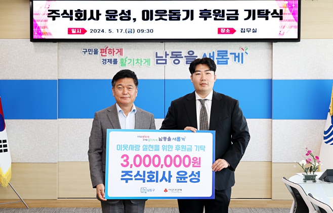 [뉴스서울] 인천시 남동구는 주식회사 윤성(대표 윤성호)으로부터 이웃돕기 후원금 300만 원을 전달받았다고 27일 밝혔다.