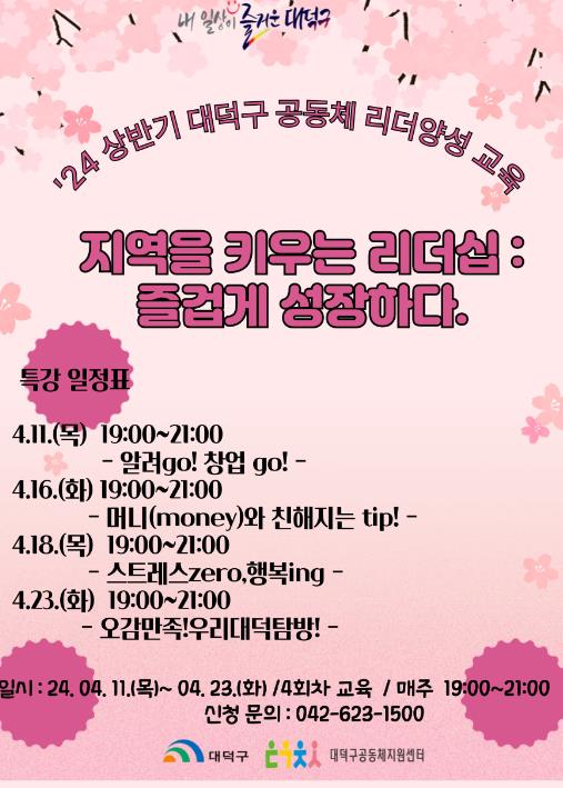 대덕구에 따르면 리더 양성 교육은 지역 주민, 대덕구 소속 단체, 대덕구공동체지원센터 공모사업에 선정된 공동체 등을 대상으로 대덕구공동체지원센터 대회의실에서 오는 11부터 23일 매주 화・목요일 오후 7부터 9시 강좌별 40명씩 총 4회 걸쳐 진행된다.