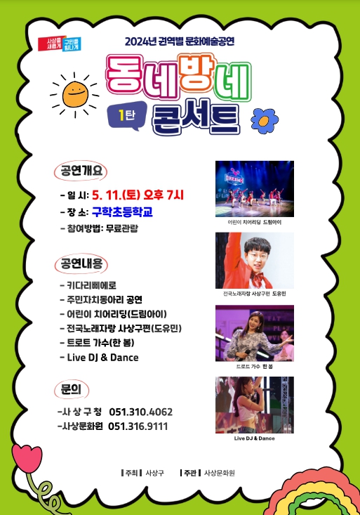 조병길 사상구청장은 “2016년부터 진행한 ‘동네방네 콘서트’는 주민들과 함께 호흡하는 사상구의 대표 문화공연”이라며 “올해 공연 역시 심혈을 기울여 준비한 만큼 많은 주민들이 오셔서 신나게 즐기고 힐링할 수 있었으면 한다”고 말했다.