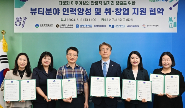 [뉴스서울] 광주광역시 서구 민·관·학이 따뜻한 행복공동체 구축을 위해 힘을 모았다. 서구는 13일 예비사회적기업 ㈜아름다운상상(대표 선숙현), 서구가족센터(센터장 윤혜경), 호남대학교 뷰티미용학과(교수 전현진), 남부대학교 향장미용학과(교수 박철호, 유민정)와 다문화 이주여성의 안정적인 일자리 창출을 위한 업무협약을 체결했다.