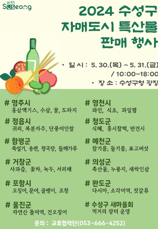 [뉴스서울] 대구 수성구는 오는 30일과 31일 이틀간 수성구청 광장에서‘2024 수성구 자매도시 특산물 판매행사’를 개최한다.