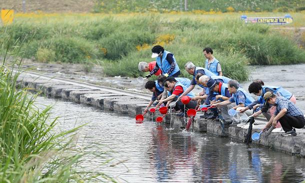 참여자들은 토종물고기 5종(붕어, 동자개, 뱀장어, 메기, 대농갱이) 치어 3만 마리를 방류했다.