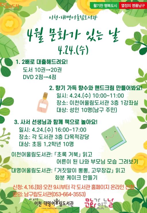 4월 문화가 있는 날 ‘사서와 함께하는 책 놀이’와 ‘나만의 향수와 핸드크림 만들기’참여 신청은 4월 16일 화요일 오전 9시부터 이천·대명어울림도서관 홈페이지에 로그인 후 신청하면 된다.