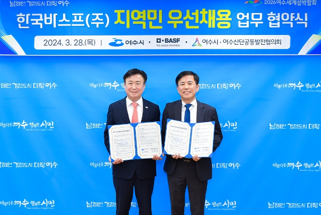 시에 따르면 지난 28일 오후 시장실에서 여수시와 한국바스프(주)가 ‘여수산단 지역민 우선채용’ 협약을 체결했다.