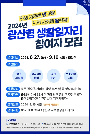 광산형 생활일자리는 광주 최초로 5억 원의 예산을 편성해 지역주민에게 일자리를 제공하고 참여자의 소득 보전, 소비활동 촉진 등 민생 경제에 활력을 도모하고자 마련했다.