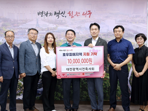 [뉴스서울] 대전 서구는 지난 31일 구청 갑천누리실에서 대전광역시건축사회와 관내 호우피해 지역 구호 성금(1,000만 원) 기탁식을 가졌다.