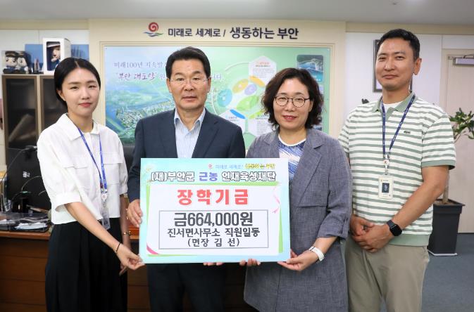 [뉴스서울] 부안군 진서면사무소 직원들은 지난 7일 부안군 근농인재육성재단에 지역인재육성을 위해 써달라며 장학금 664천원을 기탁했다.