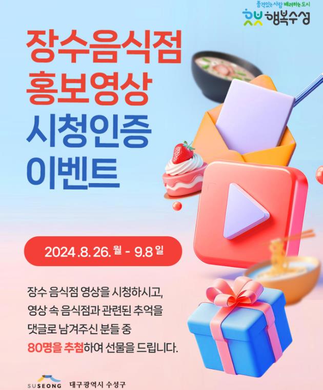 [뉴스서울] 대구 수성구는 장수음식점 홍보와 외식산업 활성화를 위해 이달 26일부터 다음 달 6일까지 홍보영상 시청 인증 이벤트를 진행한다.
