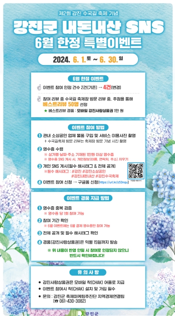 [뉴스서울] 강진군이 소상공인 살리기를 목적으로 진행 중인 ‘내돈내산 SNS 리뷰 이벤트‘를 제2회 강진 수국길축제를 기념해 6월 한달간 특별 이벤트로 진행한다고 밝혔다.