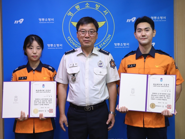 이날 인증서를 받은 주인공들은 소방사 서혜민(황간119안전센터)·이경민(영동119안전센터)·송정훈(영동119구조대) 대원이며,