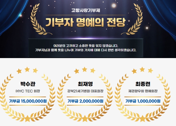 한편 지난 1월 지역사업자 장재용 대표와 5월 최재영 강북21세기병원 대표원장이 각 200만 원을, 2월에는 최종련 여수시 재경향우회 명예회장도 100만 원을 기부하며 고향사랑 기부제에 힘을 실었다.