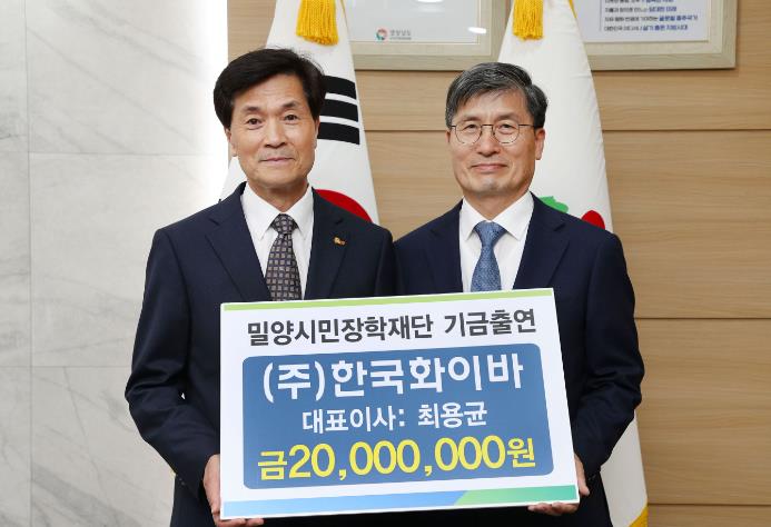 | ▲ ㈜한국화이바, 밀양시민장학재단에 장학금 2,000만원 기탁 |