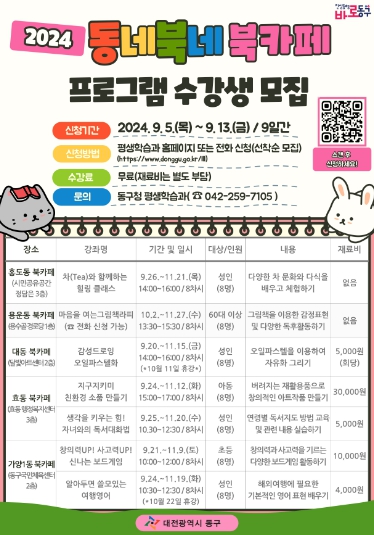 ‘2024년 동네북네 북카페 프로그램’은 관내 북카페 5개소(홍도동, 용운동, 대동, 효동, 가양1동)에서 9월 21일부터 11월 27일까지 운영될 예정이며, 동구 평생학습과 홈페이지 또는 전화로 신청이 가능하다. 수강료는 무료(재료비 별도)이다.