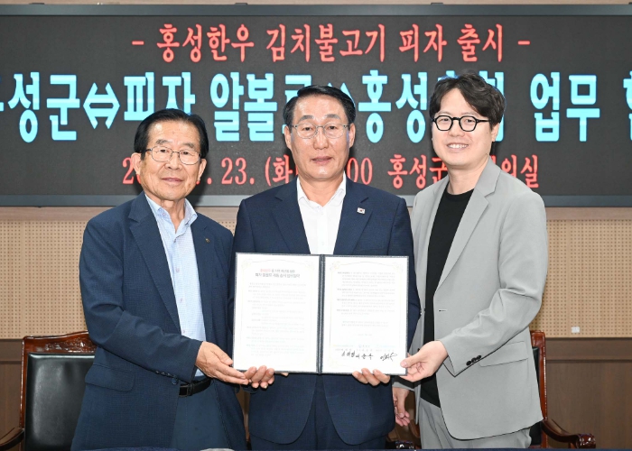 전국 제1의 축산군인 홍성군은 23일 오전 9시 군청 회의실에서 이용록 홍성군수와 이대영 홍성축협조합장, 이재욱 피자알볼로 대표가 참석한 가운데 ‘홍성한우 김치불고기피자’ 출시를 위한 협약식을 가졌다.