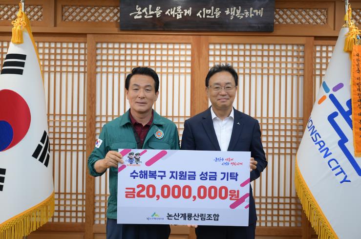 [뉴스서울] 논산시는 22일 논산계룡산림조합(조합장 신현호)에서 논산시의 빠른 수해 복구를 기원하며 2천만 원의 수재의연금을 기탁했다고 전했다.