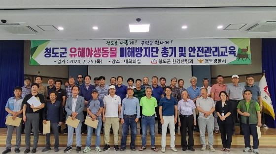 [뉴스서울] 청도군은 25일 군청 대회의실(3층)에서 수렵인들로 구성된 피해방지단 30명 및 자력구제 3명을 대상으로 `2024년 유해야생동물 피해방지단 총기 및 안전관리 교육‘을 실시했다.