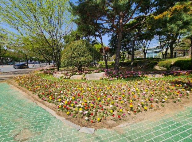 | ▲ 밀양종합운동장 진입로 꽃 화단 전경 |