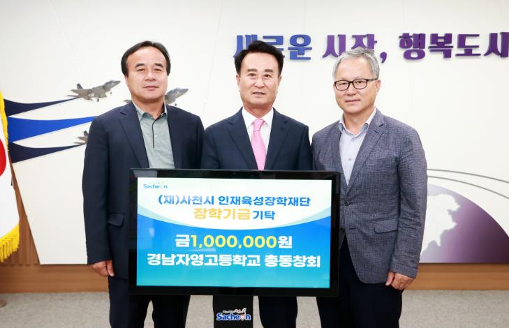 [뉴스서울] 사천시는 경남자영고등학교 총동창회에서 시청을 방문해 (재)사천시인재육성장학재단에 장학금 100만 원을 기탁했다고 3일 밝혔다.