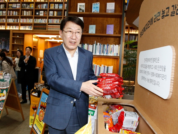 우범기 전주시장은 20일 시청 로비 책기둥도서관에서 ‘전주함께라면’ 나눔캠페인의 1호 기부자로 나서 라면을 기부했다.