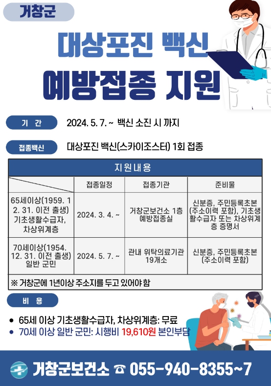 또한 65세 이상 취약계층(기초생활수급권자 또는 차상위 계층) 대상자는 신분증과 관련서류(기초생활수급권자 또는 차상위 증명서, 주민등록등초본(전입신고 날짜포함))를 지참하고 거창군보건소를 방문하면 무료로 접종을 받을 수 있다.