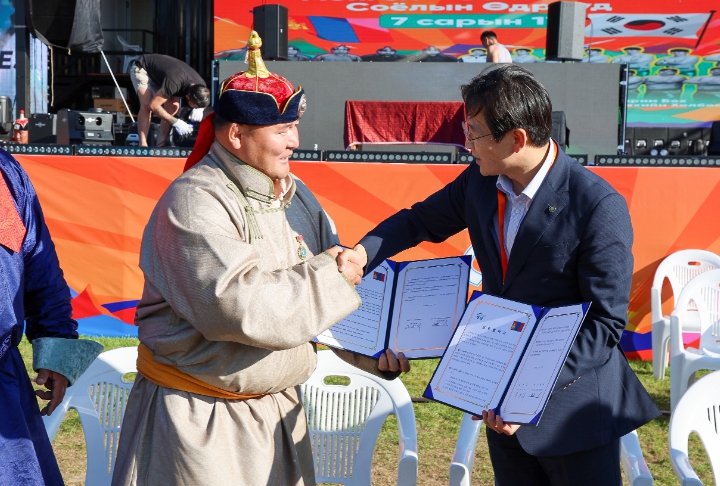 축제장에서 우승희 영암군수와 우스크바야르 몽골브흐협회장은 양국간 체육·문화 활성화에 공동노력하기로 업무협약을 맺었다.
