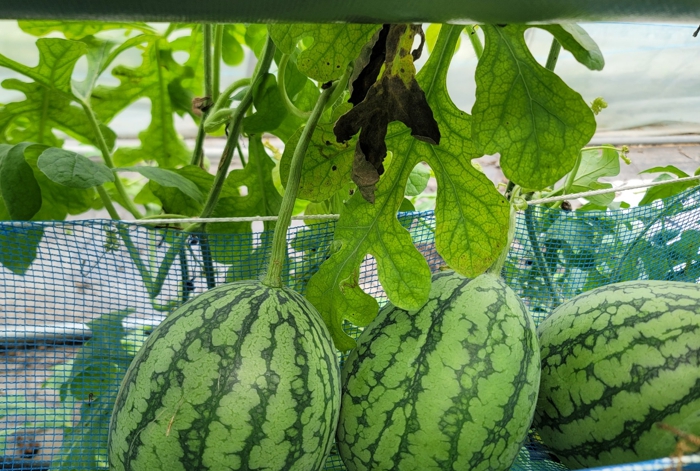 수박 재배의 장점은 기존 딸기 양액재배 시설을 활용하고 수박(중소형)이 자라면 그물망을 설치하여 수박을 안전하게 고정함으로 경영비가 크게 절감된다.