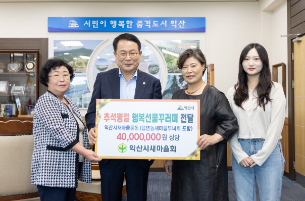 [뉴스서울] 익산시는 4일 익산시새마을회(회장 방성봉) 등 4개 단체가 추석 명절을 맞아 행복선물꾸러미 300여 세트를 전달했다고 밝혔다.