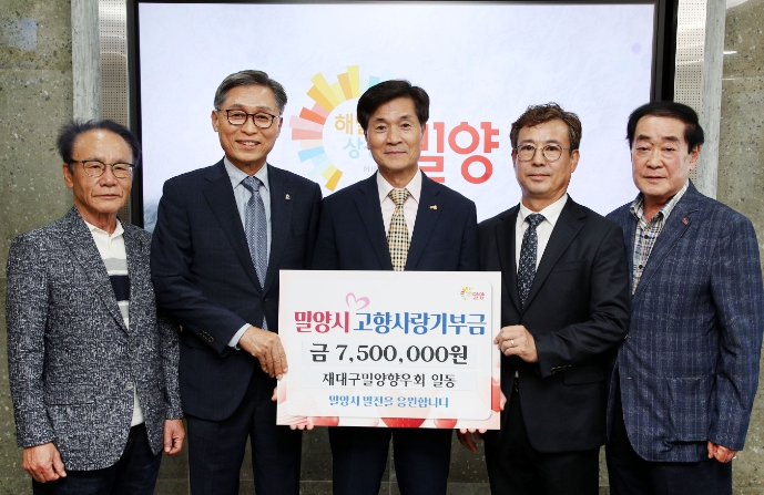 지난 3월 말에 열린 재대구밀양향우회 정기총회에서 취임한 육재원 신임 회장은 이날 5백만원을 기부하며 고향 사랑을 표현했고, 신근철 정목기업 대표, 남성곤 ㈜GS씨큐리티 대표이사, 이강범 ㈜부광에프티 대표이사도 뜻을 모아 250만원을 기부했다.