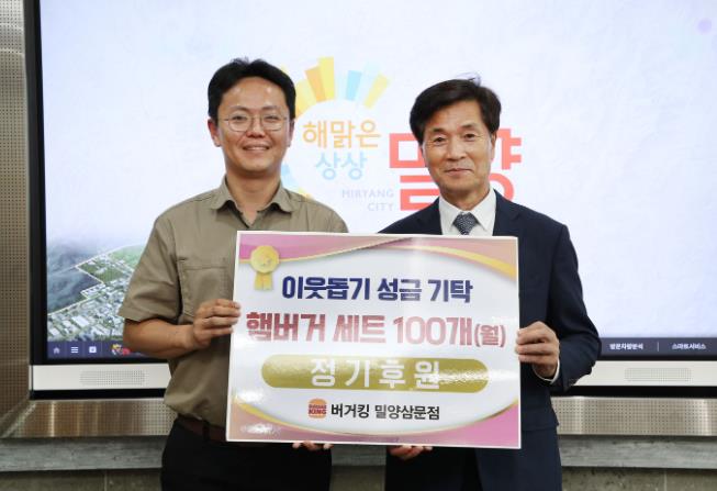 [뉴스서울] 밀양시는 지난 20일 시청 시장실에서 김성식 버거킹 밀양 삼문점 대표가 저소득 아동과 장애인 가구에 전해달라며 매월 햄버거 세트 100개를 정기후원하기로 했다고 밝혔다.