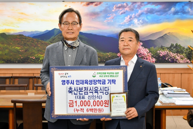 [뉴스서울] (재)영주시인재육성장학회는 지난 16일 축산본점식육식당(대표 신인식)에서 지역인재 육성을 위한 소중한 마음을 담아 인재육성장학금 1백만 원을 기탁했다고 밝혔다.