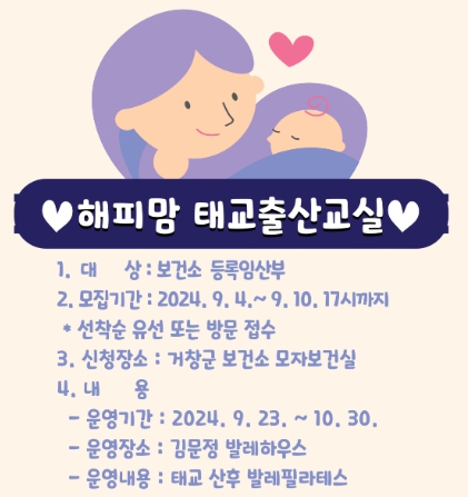 [뉴스서울] 거창군은 9월 4일부터 10일까지 임산부의 건강관리를 위한 ‘해피맘 태교·출산 교실’ 참여자 16명을 선착순으로 모집한다.