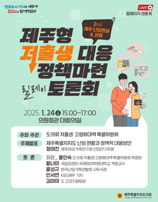 토론회는 제주형 저출생 대응 정책 마련을 위해 다양한 이슈를 중심으로 지난해부터 연속 추진하고 있으며, 이날은 특히 ‘제주의 난임 현실과 과제’를 주제로 열린다.