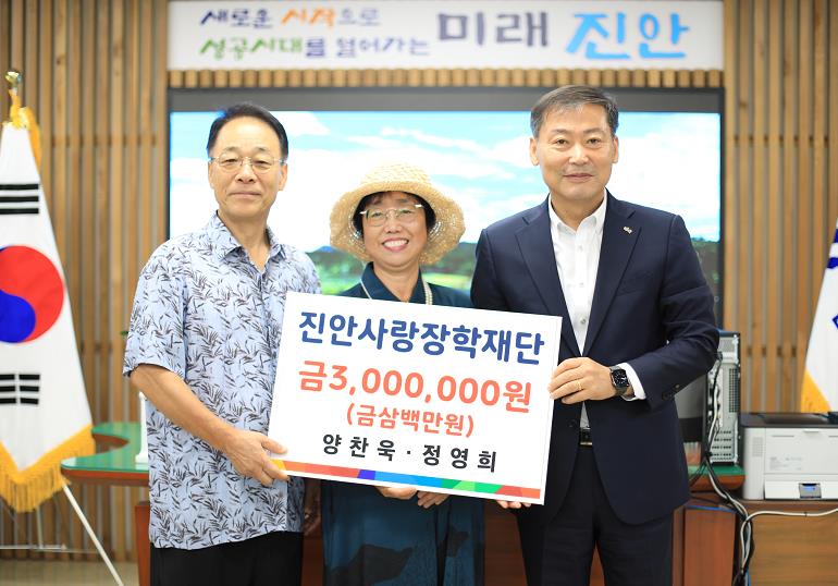 [뉴스서울] 진안군 부귀면 주민 양찬욱·정영희 부부가 23일 진안군수실을 찾아 진안사랑장학재단에 장학금 3백만원을 기부했다.