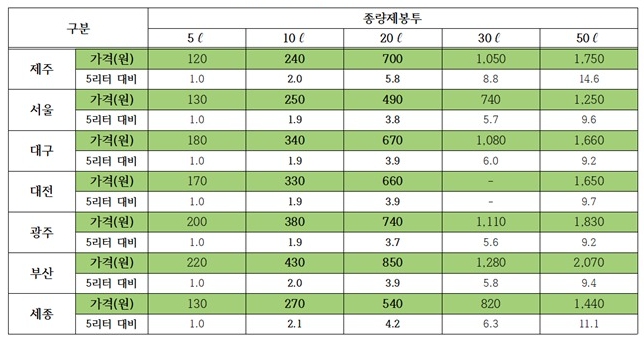▲ 지역별 종량제 봉투 판매가격 |