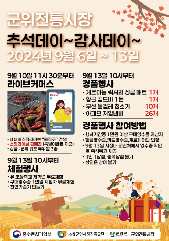 군위읍 전통시장에서 지역주민과 상인들이 모두 참여하는 이번 행사에서는 6일에서 13일 기간동안 1만원 이상인 구매 고객을 대상으로 13일 군위전통시장 야외공연장에서 추석명절 장보기행사와 더불어 경품추첨행사(게르마늄 럭셔리 싱글매트, 황금골드바)를 대대적으로 진행하며, 10일에는 라이브커머스(네이버 쇼핑라이브 방송)를 통해 군위전통시장의 먹거리를 전국에 홍보할 예정이다.
