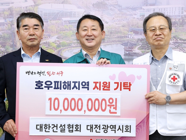 [뉴스서울] 대전 서구는 지난 30일 구청 갑천누리실에서 대한건설협회 대전광역시회와 관내 호우피해 지역 구호 성금(1,000만 원) 기탁식을 가졌다.