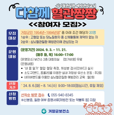 [뉴스서울] 거창군은 오는 6일부터 ‘다함께 혈관짱짱’ 심뇌혈관질환 예방관리교실 참여자 20명을 선착순 모집한다.