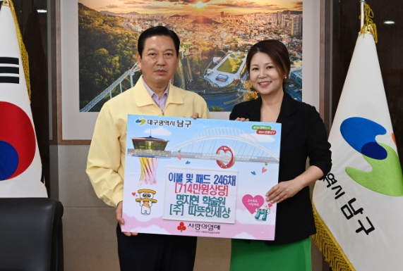 [뉴스서울] 대구 남구는 지난 7월 29일, 명지현학술원과 ㈜따뜻한 세상이 이불 및 패드 246채(714만원상당)을 기탁했다고 밝혔다.