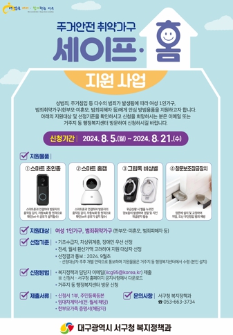 [뉴스서울] 대구광역시 서구는 관내 여성 1인가구, 범죄취약가구 등을 대상으로 '주거안전 취약가구 세이프-홈'지원 사업을 추진한다고 밝혔다.