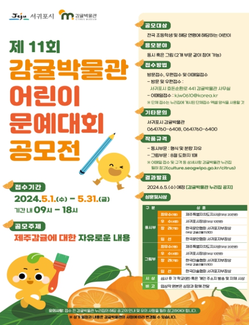 [뉴스서울] 서귀포시 감귤박물관은 5월 한달동안 전국 초등학생 및 해당 연령에 해당하는 어린이를 대상으로 제11회 어린이 문예대회 공모전을 개최한다.