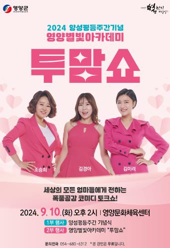 군민들의 문화욕구 충족 및 배움의 기회 확대를 위해 영양군이 마련한 9월 영양 별빛 아카데미에는, 2024년 양성평등주간을 기념해 개그우먼 김미려, 김경아, 조승희의‘투맘쇼’공연으로 꾸며진다.
