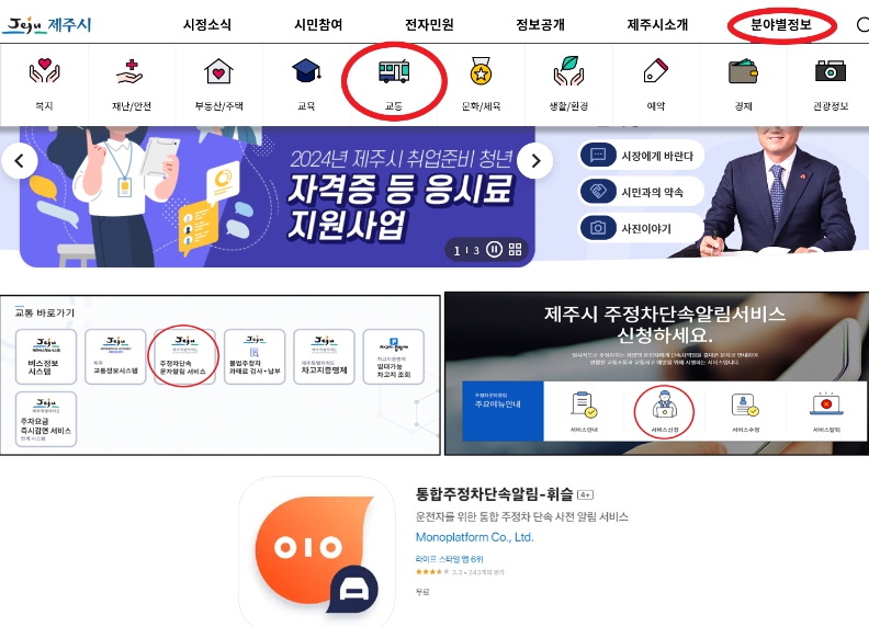 불법 주·정차 문자알림서비스 등록은 제주시 누리집 분야별 정보(교통)의 ‘주정차단속 문자알림서비스’를 통해 가입하거나, 스마트폰 애플리케이션 스토어에서 ‘휘슬’앱을 설치해 본인인증 절차 후 가입하면 된다.