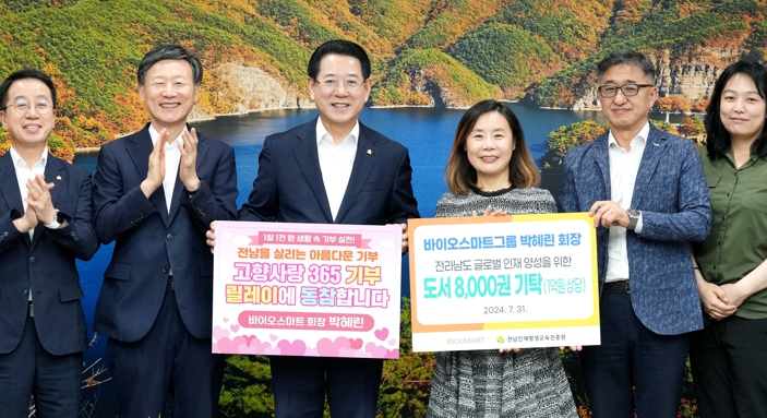 이날 바이오스마트그룹은 도서 기탁뿐만 아니라 전남 365 고향사랑 기부 캠페인 동참을 위한 기부금 기탁, 전남 사랑애(愛) 서포터즈 가입하는 등 전남도에 깊은 애정과 관심을 보여줬다.