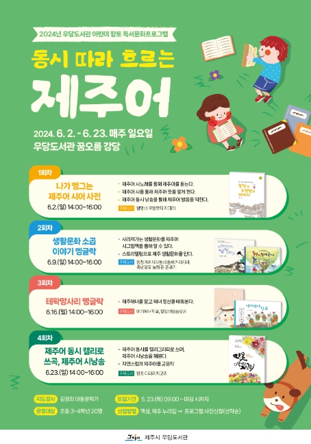 동시, 그림책, 제주어를 활용하는 이번 프로그램은 김정희 아동문학가를 초빙해 초등 3~4학년 대상으로 6월 2일부터 6월 23일까지(오후 2~4시) 매주 일요일 우당도서관 꿈오름 강당에서 진행한다.