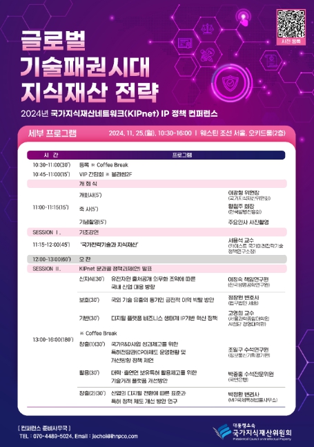 [뉴스서울] 대통령소속 국가지식재산위원회는 11월 25일, ‘글로벌 기술패권시대 지식재산 전략’을 주제로 '2024년 국가지식재산네트워크(‘KIPnet’) IP 정책 컨퍼런스'를 웨스틴 조선 서울 호텔에서 개최했다.