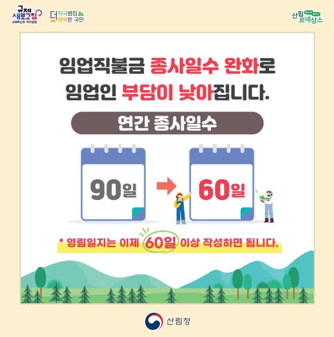 [뉴스서울] 산림청은 올해부터 임업직불금 신청자격 중 산림경영 종사일 수 기준을 기존 90일에서 60일 이상으로 완화했다고 17일 밝혔다.