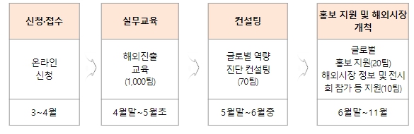 지원 규모는 실무교육 1,000팀, 컨설팅 70팀이며 이중 국제적(글로벌) 진출 가능성이 높은 기업을 대상으로 선발을 거쳐 홍보 지원 20팀, 해외시장개척 10팀을 선정하여 지원할 예정이다.