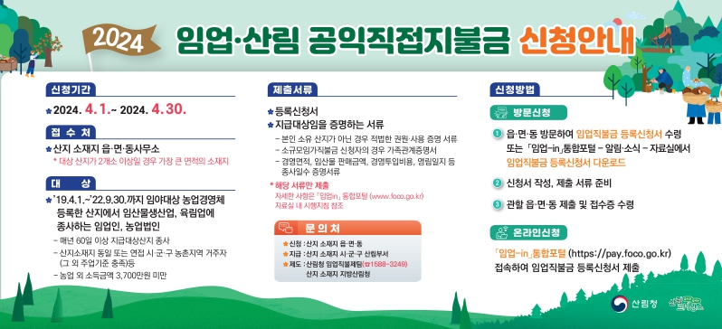 [뉴스서울] 산림청은 2024년 임업·산림 공익직접지불금 신청·접수를 2024년 4월 1일부터 4월 30일까지 진행한다고 밝혔다.