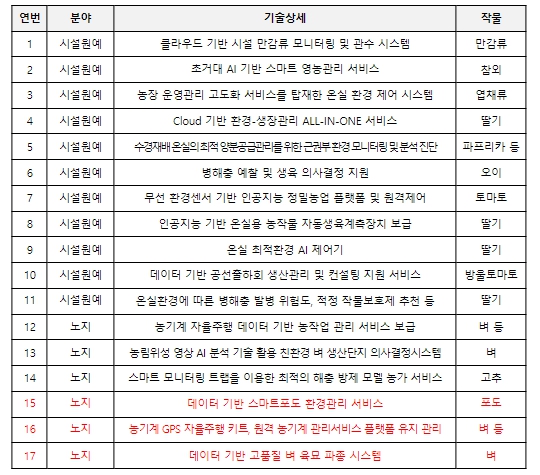 ‘AI 기반 스마트 영농관리 서비스’, ‘해충 발생 데이터 분석을 통한 방제 의사결정 지원’, ‘토양 수분・엽온(잎 온도) 데이터 등을 활용한 관수(물주기)’ 등 다양한 솔루션은 농업 경험이 부족한 청년창업농이나 귀농귀촌인의 농촌 안착에도 큰 도움을 줄 것으로 기대된다.